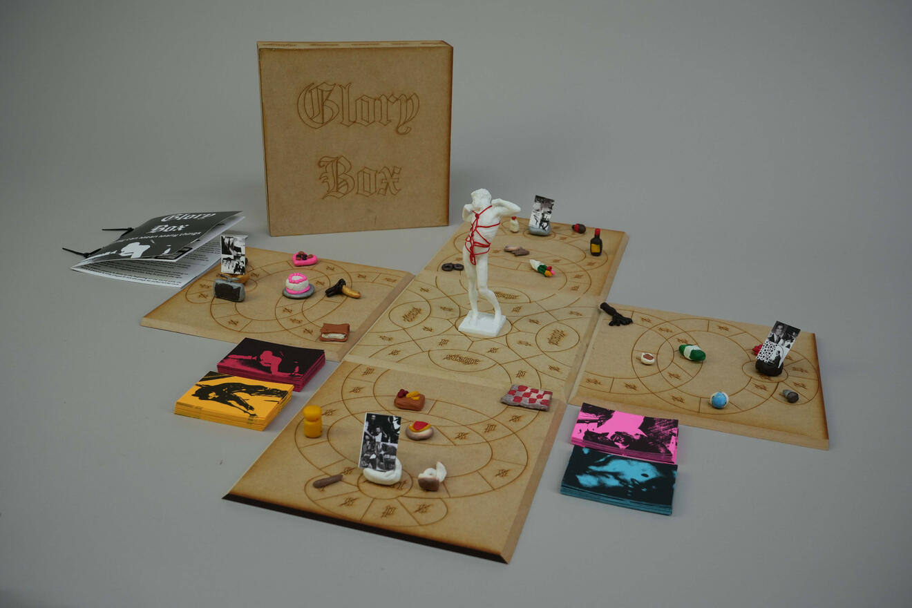 Using iconography from past kink and current BDSM practices, Glory Box is a four player board game exploring taboos surrounding BDSM (Bondage & Discipline, Domination & Submission, Sadism & Masochism). By redigesting past and present kink practices into mechanics similar to that of Parcheesi & Clue. Set at a social club each player was invited to for their abnormal proclivities, play is insighted by the draw of a beauty from across the room.