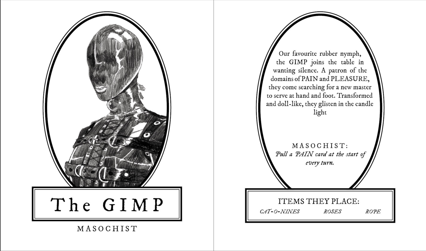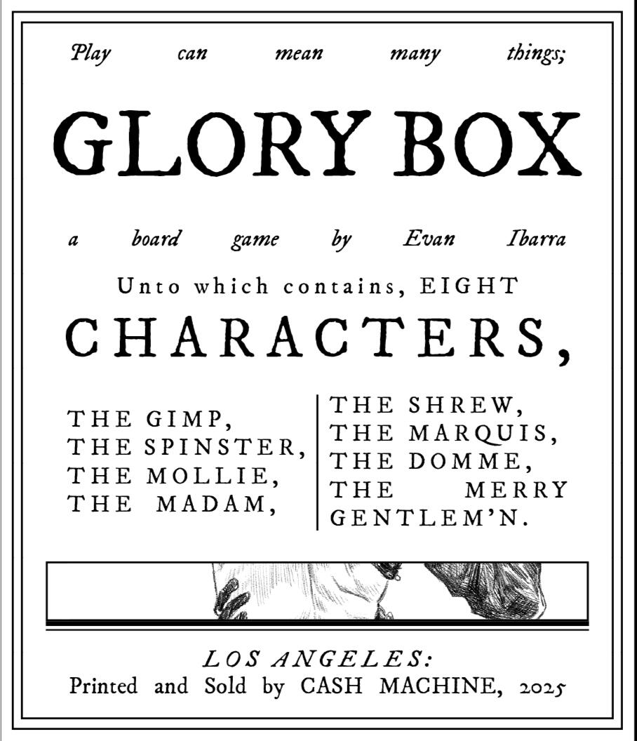 Using iconography from past kink and current BDSM practices, Glory Box is a four player board game exploring taboos surrounding BDSM (Bondage & Discipline, Domination & Submission, Sadism & Masochism). By redigesting past and present kink practices into mechanics similar to that of Parcheesi & Clue. Set at a social club each player was invited to for their abnormal proclivities, play is insighted by the draw of a beauty from across the room.